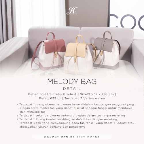 Melody Backpack From Jims Honey memiliki gaya cute minimalis dengan pengunci yang elegan serta model tali yang dapat diserut sebagai fungsi untuk membuka dan menutup tas????